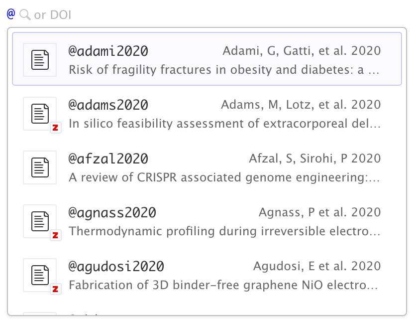 You can also insert citations directly using markdown syntax (e.g. [@cite]). When you do this a completion interface is provided for searching available citations: